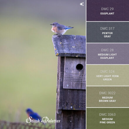 Color palette for your embroidery with the following thread colors: Very Light Gray Green, Light Avocado Green, Dark Blueberry, Blueberry, Medium Dark Blue Violet, Medium Lavender