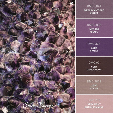 Color palette for your embroidery with the following thread colors: Dark Fuchsia, Eggplant, Light Antique Violet, Very Dark turquoise, Very Dark Gray Green, Very Dark Pewter Gray