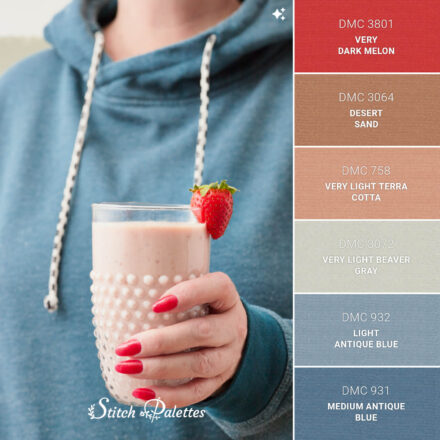 Use the embroidery color chart below to convert this palette between three types of thread.