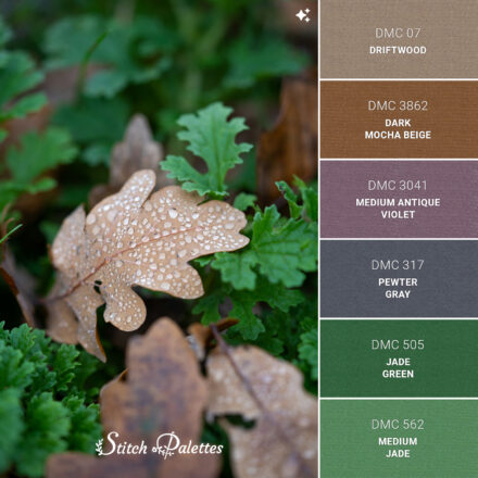 Use the embroidery color chart below to convert this palette between three types of thread.