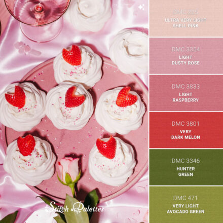 Use the embroidery color chart below to convert this palette between three types of thread.
