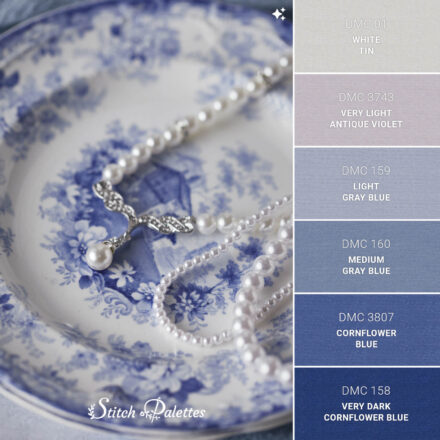 Color palette for your embroidery with the following thread colors: Ultra Very Light Mocha, Ultra Very Light Shell Pink, Very Light Antique Violet, Light Blue, Dark Wedgwood, Ultra Very Dark Baby Blue