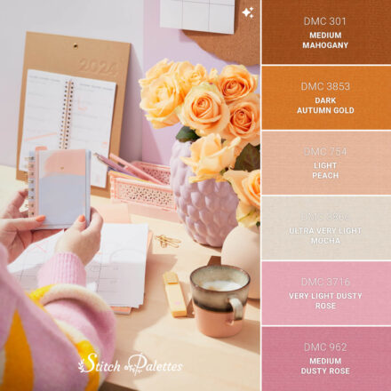 Use the embroidery color chart below to convert this palette between three types of thread.
