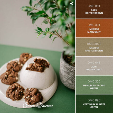 Use the embroidery color chart below to convert this palette between three types of thread.