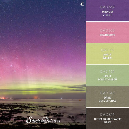 Use the embroidery color chart below to convert this palette between three types of thread.