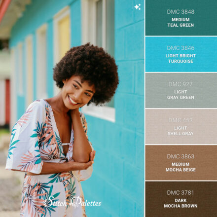 Use the embroidery color chart below to convert this palette between three types of thread.