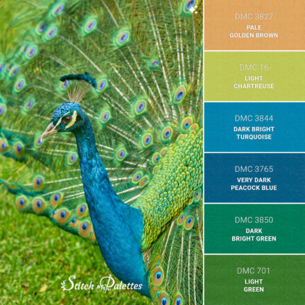 Use the embroidery color chart below to convert this palette between three types of thread.