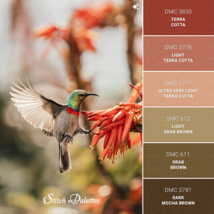 Color palette for your embroidery with the following thread colors: Light Sky Blue, Medium Apricot, Dark Burnt Orange, Terra Cotta, Medium Rosewood, Very Dark Brown Gray