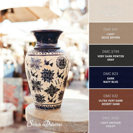 Use the embroidery color chart below to convert this palette between three types of thread.