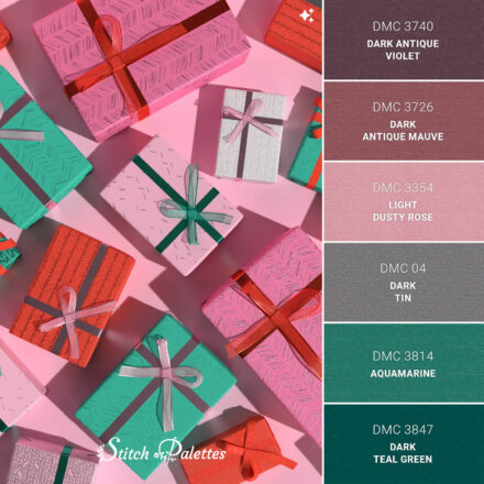 Use the embroidery color chart below to convert this palette between three types of thread.